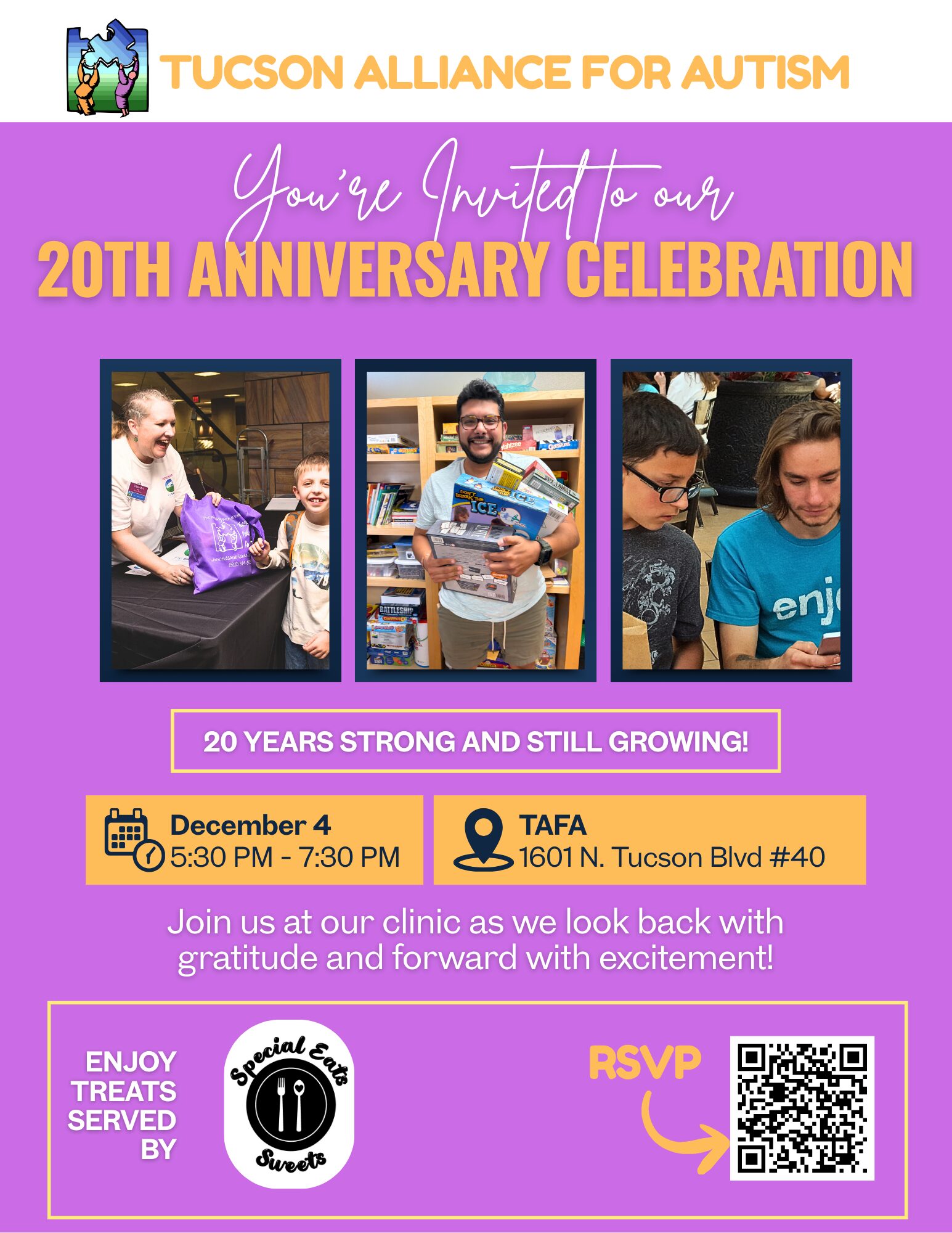 2025 marks TAFA’s 20th Anniversary serving the Tucson Community. Join us at our clinic as we look back with gratitude and forward with excitement! Help us celebrate by touring our clinic and enjoying some sweets made with love from Special Eats Sweets! We’ll have some additional snacks and refreshements as well.